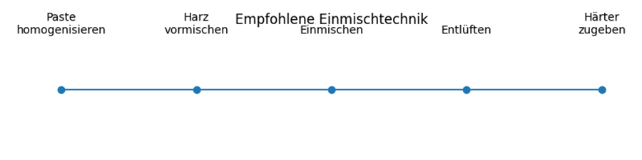 Nach dem Mischvorgang ist eine Entlüftung erforderlich, um eingeschlossene Luftblasen zu entfernen, die sonst zu optischen Fehlern führen können. Erst nach vollständiger Homogenisierung darf der Härter zugegeben werden, da eine frühzeitige Zugabe zu lokalen Reaktionsstörungen und ungleichmäßiger Aushärtung führen kann.
